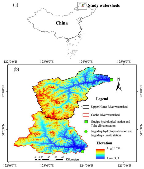 Daily climatic data of the UHR and GR watersheds from 1975 to 2013 are obtained from Tahe (Climate ID: 50246) and Jiagedaqi (Climate ID: 50442) climate stations (Figure 1b), respectively. The annual precipitation, annual snowfall, seasonal precipitation were calculated from the daily precipitation data including daily rainfall and daily snowfall. The seasonal precipitation includes spring (April and May)/summer (June to August)/autumn (September and October) precipitation and spring rain. The spring rain ratio equals to the percentage ratio of spring rain to spring precipitation. Daily mean air temperature was used to calculate annual mean/maximum/minimum air temperature (Tave, Tmax, Tmin) and April/May/June accumulated snowmelt temperature (Ta4, Ta5, Ta6). The accumulated snowmelt air temperature refers to the sum of the temperature over 0 °C during the snowmelt period. We acknowledge that there may be some spatial heterogeneity in precipitation across both watersheds but we believe this heterogeneity to be minimal because the study region is mainly characterized by low hills with gentle undulations [29]. In order to test such inference, the annual gridded precipitation data in both watersheds from a separate database, “0.5° × 0.5° gridded database of annual surface precipitation in China” [30], have been used to test the accuracy of the precipitation data obtained from both climate stations. Also, we acknowledge that although the temperature would not be uniform across the site, we expect that the trends in temperature obtained at both climate stations would be reasonably representative of the trends of the watershed-averaged values for the sites.
