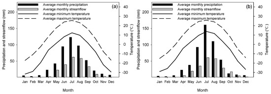 Daily discharge data for the UHR and GR watersheds are available from 1975 to 2013. Following the protocol of “Observation Methodology for Long-term Forest Ecosystem Research” of the National Standards of the People’s Republic of China (GB/T 33027-2016), daily discharge data of UHR and GR watersheds were calculated based on the relationship between streamflow and discharge stage height collected at the Guqigu and Jiagedaqi hydrometric stations, respectively (Figure 1b). The data in 1983 of the UHR watershed is unavailable because the data in the wet season were missed. No dams or hydropower stations regulate flow in either study watersheds. The annual streamflow hydrography of the study watersheds is characterized by high flow during the snowmelt season in May and the peak in summer from June to August coinciding with peak rainfall [28], respectively.