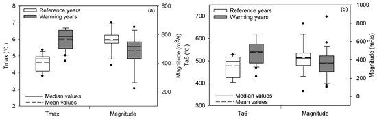 The box plot of Tmax and high flow magnitude in pairing reference and warming years in the UHR (a); and Ta6 and high flow magnitude in the GR (b) watersheds.