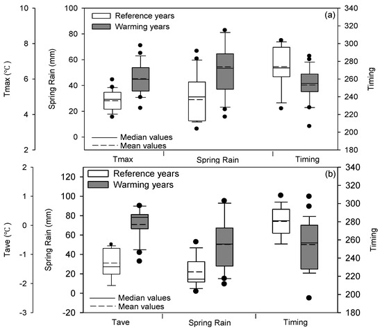 The box plot of Tmax, Tave, spring rain and high flow timing in pairing reference and warming years in the UHR (a) and GR (b) watersheds.