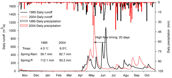 The timings of high flows in two watersheds were both significantly (p < 0.01) lower in the warming years than those in the reference years (Figure 5a,b, Table 7). For the UHR watershed, the average timing of high flows in warming years was significantly advanced by 21 days associated with the increases of 1.2 °C and 25.3 mm in Tmax and spring rain, respectively. This means every 0.1 °C increase in Tmax and 2.0 mm increase in spring rain can cause the average high flow timing to be advanced by 1.7 days in the UHR watershed. For example, the average timing of high flows was advanced by 20 days for the paired years of 1985 and 2004 when the Tmax and spring rain increased by 2.0 °C and 43.0 mm (Figure 6), respectively. The average high flow timing of GR watershed in the warming years was significantly (p < 0.05) advanced by 25 days because of the increases of 1.3 °C and 28.3 mm in Tave and spring rain, respectively, which indicates that every 0.1 °C increase in Tave and 2.1 mm increase in spring rain can lead to 1.9 days earlier average high flow timing.