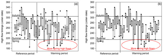 High flow timings for each year in the UHR (a) and GR (b) watersheds.