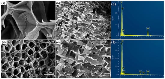 Figure 1 presents the SEM images and energy dispersive spectrum (EDS) diagrams of the chitosan magnetic spheres and La-chitosan magnetic spheres. The samples both exhibit a typical uniform and regular porous structure with 15 µm of pore size (Figure 1a,d). More vividly, the structure of as-prepared spheres is similar to honeycomb-like shape, which is similar to what is reported in the literature []. In addition, the surface of La-chitosan magnetic spheres seems rougher and presents an arc sheet shape (Figure 1b,e). And it’s obvious and intuitive that the lamellar surface of La-chitosan magnetic spheres is uniformly covered with a mesh of rod-like particles (Figure 1b,e), which is more favorable for adsorption of phosphate. As can be seen from the EDS diagrams in Figure 1c,f, it’s clear that lanthanum elements could be clearly observed and contained inside the La-chitosan magnetic spheres compared to the chitosan magnetic spheres.