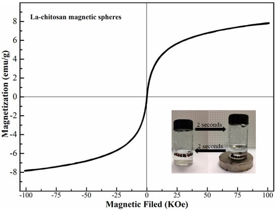 The magnetization curves of La-chitosan magnetic spheres from the analysis of a vibrating sample magnetometer (VSM) at room temperature is shown in Figure 2. It can be seen that the saturation magnetization intensity of La-chitosan magnetic spheres is 7.90 emu/g. Meanwhile, as shown in the inset photo of Figure 2, with a magnet placed at the bottom of the bottle, the adsorbents that originally floated on the surface of the water would quickly sink to the bottom within 2 s, which intuitively shows the good magnetic properties and completely achieves solid-liquid separation for recovery and reuse from the treated solution.