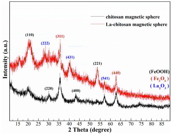 XRD results of the chitosan magnetic spheres and La-chitosan magnetic spheres are shown in Figure 3. It could be seen that there were three obvious characteristic peaks at 20°, 33.3°, and 43°, corresponding to the (110), (220), and (400) crystal plane positions of FeOOH of which hydroxyl groups are coordination groups and have better adsorption effects on phosphate ions. In addition, two obvious characteristic peaks at 35°, and 62.5° were presented, which certifies the existence of Fe3O4. Based on the above, the main forms of the metal compounds in chitosan magnetic spheres are FeOOH and Fe3O4. From the XRD pattern in red curve, it’s found that the distinct characteristic peaks at 28°, 43° and 58° corresponded with (222), (431) and (541) crystal plane positions of lanthanum oxide. Thus, the Fe and La elements in the La-magnetic chitosan spheres were mainly present in the form of Fe3O4, FeOOH, and La2O3, which are consistent with the weak magnetism of the material (Figure 2). Moreover, the presence of La2O3 (marked blue peaks in Figure 3) is also a key factor that increased the adsorption capacity of phosphate on the adsorbent.
