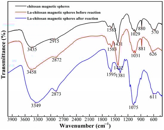 Figure 4 shows the FTIR spectra of chitosan magnetic spheres and La-chitosan magnetic spheres before and after the reaction. The peak at 3435 cm−1 of the chitosan magnetic spheres represents the stretching vibration peak of –NH/–OH. The characteristic absorption peak of –CH and –CH2 derived from chitosan is located at 2915 cm−1. The peak at 570 cm−1 shows the Fe–O vibration peak of Fe3O4, which is consistent with the results of XRD spectrogram (Figure 3). Compared with the chitosan magnetic spheres, the bending vibration strength of the N–H is much larger before the reaction, which may be due to the bending of the N–H after the La3+ coordinates with the nitrogen atom of the chitosan to increase steric hindrance. C–O stretching vibration peak moves from 1029 cm−1 to 1031 cm−1, and the intensity increases, probably because La3+ coordinates with hydroxyl oxygen atoms of chitosan afterwards, the electron density of the oxygen atoms was reduced, and C–O bond was weakened. The vibration peak of Fe–O is shifted to 626 cm−1. Combined with XRD analysis, it is presumably due to the formation of FeOOH. Compared with the results before the reaction, the peak at 1432 cm−1 of La-chitosan magnetic spheres almost disappeared and moved to 1381 cm−1 after the reaction, indicating that hydroxyl was involved in the adsorption process of phosphates.