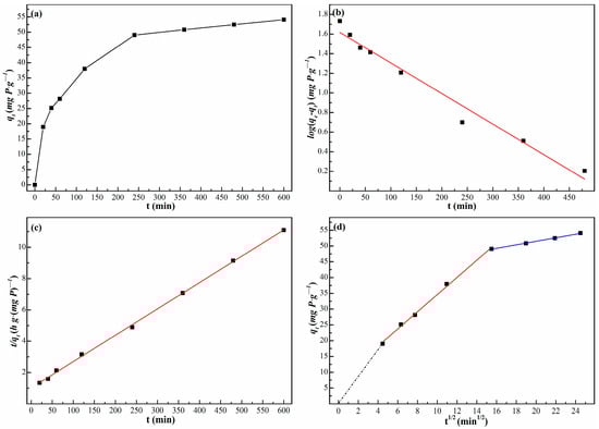 (a) Effect of contact time on the adsorption capacity of La-chitosan magnetic spheres, (b) pseudo-first-order model, (c) pseudo-second-order model, and (d) intra-particle diffusion model.