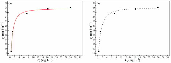 As shown in Figure 6, Langmuir (a) and Freundlich (b) isotherm models were used to evaluate the adsorption isotherms of phosphate by La-chitosan magnetic spheres. Meanwhile, the estimated model parameters with the coefficient of determination (R2) for the different models are shown in Table 2. The coefficient of determination, R2, given in the Table 2, shows that the both Freundlich and Langmuir isotherm models can be used to explain the adsorption isotherms of La-chitosan magnetic spheres well. In the cases of R2 values, the applicability of the above models, based on current experimental data, follows the order: Langmuir > Freundlich. Clearly, The R2 values obtained for the Freundlich and Langmuir models were both above 0.98, indicating that both monolayer adsorption and multilayer adsorption occur in the system as shown in Figure 6. Results similar to those in this paper have been reported for the adsorption of phosphate in other literature []. According to the Langmuir model, the maximum phosphorus adsorption capacity reached 27.78 mg P·g−1. Moreover, RL values (0.0379) fall within the range of 0–1.0, implying that the phosphate adsorption onto La-chitosan magnetic spheres is favorable.