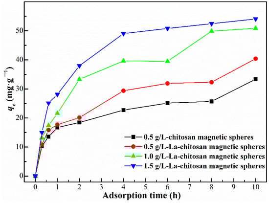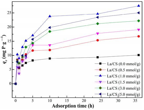 Figure 8 shows the adsorption efficiency of the La-chitosan magnetic spheres with different La/CS ratios. It is obvious that the adsorption capacity of chitosan magnetic spheres reached only 10 mg P·g−1, while the adsorption capacity of La-chitosan magnetic spheres generally increased with the change of La/CS ratio. In addition, it can be seen that the optimal La/CS ratio is 1.0 mmol/g, and the adsorption capacity reaches 27.49 mg P·g−1. We can find that the fluctuation of adsorption capacity was occurred during the first 1.0–3.0 h. The reason for this phenomenon may be due to the freeze-drying process in the preparation of materials. When the adsorbent is just in contact with the phosphorus solution at the beginning, it adsorbed a large amount of phosphorus solution, resulting in a sudden increase in the amount of adsorption. When the adsorbent is moist enough, part of the solution will overflow, resulting in a slight decrease in the amount of adsorption. It is worth pointing out that the irregular changes of adsorption capacity of phosphate in water were showed in the first 1.0 h due to the incipient wetting process of freeze-dried materials. Thus, with the completion of wetting process, the amount of phosphate adsorbed in water gradually increased, as shown in Figure 8.