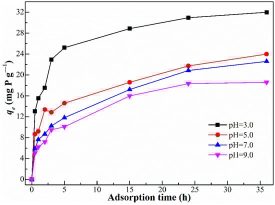 In general, pH of the aqueous solution affects the existing state of the substance in the solution and the surface charge is usually considered as a vital and meaningful variable that interferes with the adsorption of ions at water–adsorbent interfaces in the adsorption process. The adsorption of phosphate on La-chitosan magnetic spheres were studied at various pH values ranging from 3.0 to 9.0, as shown in Figure 10. When the pH value is 3.0, the adsorbent capacity of La-chitosan magnetic spheres reaches the maximum equilibrium adsorption and is significantly higher than that under the other pH conditions. When the pH value increased from 3.0 to 9.0, the adsorption capacity gradually decreased. On the one hand, the surface of the adsorbent will carry more negative charges at higher pH value, making it reject negatively charged ions in the solution. In the alkaline solution, the competitive relation adsorption active center of adsorbents between the phosphate ions and OH− ions was significantly enhanced and resulted in a significant decrease in the capacity of phosphate. On the other hand, when the pH of the solution is greater than the point of zero charge, the common ion repulsion or electrostatic repulsion force is dominant. In addition, phosphate acid exists as four different chemical forms (H3PO4, H2PO4−, HPO42−, and PO43−) at different pH ranges (H3PO4 ↔ H2PO4− + H+ (pKa1); H2PO4− ↔ HPO42− + H+ (pKa2); HPO42− ↔ PO43− + H+ (pKa3)). The dissociation constants for above three reactions are pKa1 = 2.15, pKa2 = 7.20 and pKa3 = 12.33, respectively []. When the pH of solution is between 2.15 and 7.20, the phosphate acid exists mainly in the form of H2PO4−, which is the greatest affinity for the La-chitosan magnetic spheres to form La (OH)2+. As a result, the adsorbent has a large adsorption capacity, which is basically consistent with the experimental results (Figure 10).