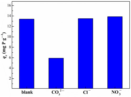 Several anions such as CO32−, Cl−, and NO3− are common in natural freshwater, and could participate in the phosphate adsorption process by means of competition of adsorption sites of adsorbents. Figure 11 obviously shows the effect of coexisting ions including CO32−, Cl−, and NO3− (0.1 mol·L−1) on the adsorption of La-chitosan magnetic spheres. It is clearly found that Cl− (13.51 mg P·g−1), and NO3− (13.88 mg P·g−1) has the slight/negligible influence on adsorption capacity of La-chitosan magnetic sphere, compared with blank group (13.69 mg P·g−1), which means that there is almost no competitive adsorption between the above-mentioned ions (0.1 mol·L−1 Cl− and NO3−) and the phosphate ions on La-chitosan magnetic spheres. However, CO32− (5.92 mg P·g−1) has wielded the most significant influence, which could be attributed to the smaller solubility product constant (Ksp) (3.98 × 10−34) of La2(CO3)3 compared with the Ksp of LaPO4 (3.70 × 10−23). The competitive relationship for the adsorptive sites between co-existing CO32− and phosphate in solution is formed, then resulting into a sharp decrease in the phosphate adsorption capacity [].