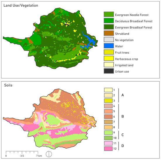 Upper: Actual land-use scenario. Lower: Soils map: (A) Slow infiltration rates with a layer that impedes the downward movement (high runoff potential). (B) Moderate infiltration rates, moderately deep to deep, moderately well to well drained and a moderate rate of water transmission. (C) High infiltration rates, deep and well to excessively drained and a high rate of water transmission (low runoff potential). (D) Very slow infiltration rates, soils with a clay, shallow soils over nearly impervious materials.