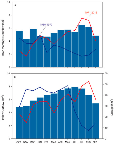 (A) Average river regimes in Boadella gauge station: blue bars: (1950–2013), blue line (1950–1970), and red line (1971–2013). (B) Average monthly values of inflows (blue), outflows (red), and storages (blue bars) in the reservoir of Boadella between 1971 and 2013.