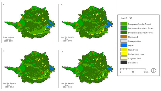 Land-use change scenarios 2002–2050. (A) Actual land-use scenario. (B) Step 1 = land-use scenario of 2021–2030. (C) Step 2 = land-use scenario of 2031–2040. (D) Step 3 = land-use scenario of 2041–2050.