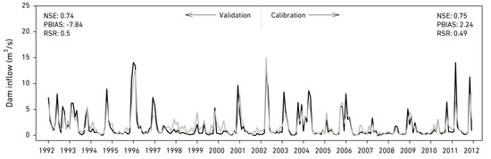 Once calibration is completed, an independent data period (1992–2001) was chosen for validation. This involved a comparison of simulated and observed flows with no longer parameter optimization (Figure 5). In general, the validation can be considered high quality given the strong agreement between the observed and modeled data and the statistics, which were close to the calibration period (Table 3). In general, the statistics reveal that RHESsys accurately reproduces the dam inflow for the studied basin and the streamflow seasonality (Figure 6)