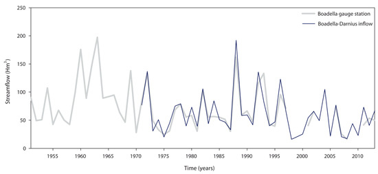 Observed annual streamflow at the Boadella gauge station (grey) and at the Boadella–Darnius dam inflow (blue).