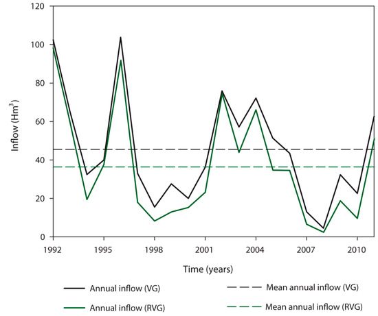 Two simulations have been carried out for the period 1992–2011 to assess the effect of vegetation on the flow: the VG simulation, with land-use cover used in the calibration process (Figure 4A), and the RVG simulation, with the land cover shown in Figure 4D, where a revegetation process is assumed. Figure 8 shows the VG and RVG simulations, and it is evident that the reduction in the annual average of the reservoir inflow between VG and RVG simulations (20.18%) is associated with the effect that the revegetation processes have on the flow.