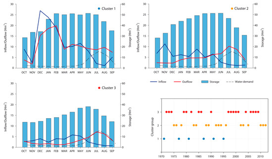 Relationship between Boadella–Darnius dam management strategy and annual and seasonal rainfall observed during the study period (Clusters 1, 2, and 3). Blue line: inflow; red line: outflow; light blue bars: storage; black dashed line: mean monthly water demand regime (2002–2011). Time sequence of the different cluster groups representing dam management strategies (down right).