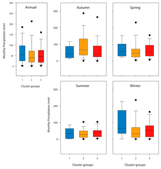 Annual and seasonal rainfall distributed yearly according to the different cluster groups.