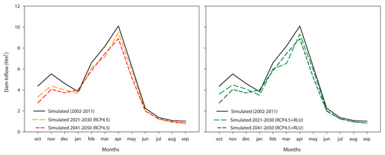 Figure 11 shows the mean monthly dam inflow simulated for the current, short-term, and mid-term future periods, under climate change conditions (RCP4.5, left plot) and under a combined action of climate and land-use change scenarios (RCP4.5 + RLU, right plot). The simulations under climate change conditions revealed a pattern similar to those of the control period (2002–2011) with a general mean decrease of about 10% (spring, summer, and winter) and a greater decrease in autumn for the mid-term period (29.6%). The RCP4.5 + RLU scenario shows a slightly larger decrease in streamflow. The mean decrease in spring, summer, and winter is about 12–13%, while in autumn changes are close to 30% for the period 2041–1050. A smaller decrease is estimated for January (from 3.9% at mid-term RCP4.5 to 8.8% under RCP4.5 + RLU), and there is an increase in January flow (4.9%) for RCP4.5 projections. The January flow increases (and smaller declines) likely reflect the contribution of earlier snowmelt. This trend is also shown in the RCP4.5 + RLU where the streamflow decrease is lower for long-term scenarios (4.4%) in comparison to short-term (8.8%). The highest decrease is in October–November (autumn) in the long term under both scenarios (36.7/26.7% and 34.9/29.6%, respectively). The mean values show that the revegetation processes can accentuate flow decreases, since under the RCP4.5 scenario the decrease is 14.3% and under RCP4.5 + RLU is 17%. Annually, a mean decrease of 11.1 and 14.7% is observed for short-term and mid-term time windows without consideration of land-use changes (RCP4.5). On the simulations under the RCP4.5 + RLU scenario the decrease projected for the same periods is 11.9 and 17% respectively.