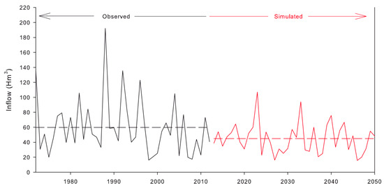 Annual dam inflow (hm3) for observed period 1971–2011 (black line) and simulated 2012–2050 (red line). Dashed lines show the average of each period.