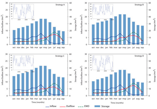 The mean monthly reservoir storage for each of these strategies was calculated together with mean monthly, inflow, outflow, and EWD (Figure 13). In the upper left of each figure, the time series of monthly reservoir storage for the simulation period 2021–2050 is shown. Where there are differences in the minimum reservoir, 0 hm3 (enabling the depletion reservoir) in Strategies A and D and 16 hm3 (avoiding the depletion reservoir) in B and C can be observed. In the strategies in which the reservoir is depleted, the reserves for the following year are below 20 hm3 on average, which implies the need for sufficiently high inputs into the reservoir in the following year to avoid greater differences between EWD and outflow.