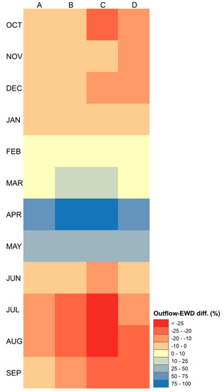 Mean monthly differences between outflow and EWD (2021–2050) in the four experiments.