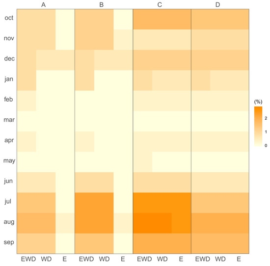 Mean monthly percentage where the different water demands (EWD, WD, and E) are not met in the established strategies (A, B, C, and D).