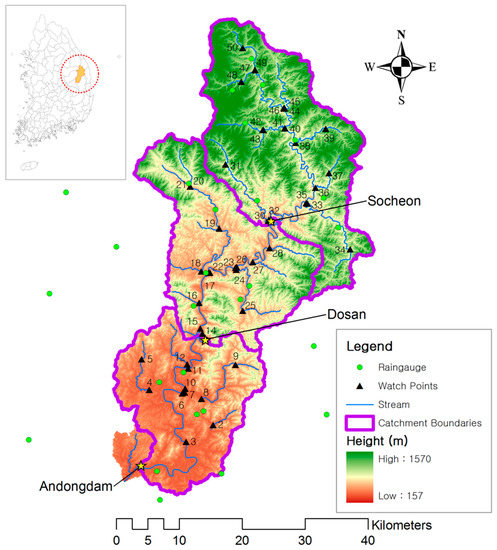 The study area is the Andongdam catchment (1584 km2) located in the eastern part of South Korea (Figure 1). This mountainous dam catchment includes a large reservoir that secures water for domestic, industrial and agricultural use. The reservoir is also designed for downstream flood flow control. This catchment is composed of 1.4% urban area, 11.9% agricultural area, 82.2% forest, 2.1% grassland and 2.4% water area. Hydrologic soil groups of this catchment consist of 0.8% group A, 17.2% group B, 5% group C and 77% group D. The drainage characteristics of the soil in this catchment consist of 78.6% very good, 13.5% good, and 7.9% bad. This study utilized hourly observed streamflow at three gauge locations (Andongdam, Dosan, and Socheon) for calibration and validation of model parameters. The authors converted the water level and rating data from the Water Resources Management Information System (www.wamis.go.kr) into the observed flow data.