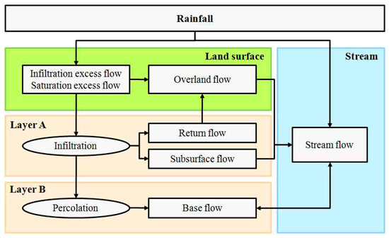 Schematic diagram of the grid-based rainfall–runoff model (GRM) (taken from [38]).