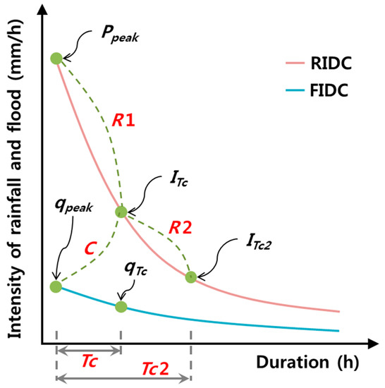 Schematic plot for the calculation of the runoff coefficient (C) and rainfall intensity ratios ( and ); Tc is the time of the concentration in hour; Tc2 is TC multiplied by two; C is the ratio between the flood peak () and the mean rainfall intensity during TC (); is the ratio between the rainfall peak () and ; and is the ratio between and the mean rainfall intensity during two TCs (). FIDC and RIDC are flood-intensity-duration curve and rainfall-intensity-duration, respectively.