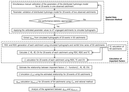 Equation (20) shows that the peak flow in the ungauged catchments can be calculated using the rainfall time series, CN, and the relationship for C. It means that the peak flow of the ungauged catchment can be calculated conveniently using Equation (20) without repeatedly conducting hydrological simulation. Note that is a function of the and CN as shown in Equation (18); therefore, and CN are used for the calculation of instead of using . The complete flow of the research method is summarized in Figure 4.