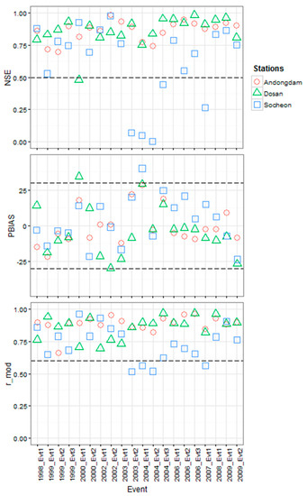 Model performance evaluation statistics of the Nash–Sutcliffe efficiency (NSE), percent bias (PBIAS), and (r_mod) for the calibration (Andongdam) and validation (Dosan and Socheon) catchments for 20 events. The black dashed lines represent the acceptance boundaries of the performance evaluation statistics: NSE > 0.5, PBIAS ± 30%, and > 0.6.