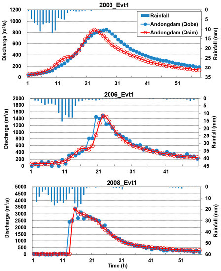 Observed hydrographs and simulated hydrographs by parameter calibration for three events in the Andongdam catchment.