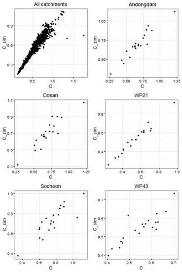 Figure 7 shows the values of C and for all 50 catchments (“All catchments”) and the five selected catchments (Andongdam, Dosan, WP21, Socheon, and WP43) using 20 flood events. C was calculated using the outputs of GRM model as described in Section 3.2. was calculated using Equation (21), where was calculated using Equation (18). C and are very consistent in “All catchments”, except for two outliers, and the r-squared value between them (Table 1) is high (0.9). The results in five selected catchments also show a good agreement with minor dispersion (Figure 7). Table 1 shows that most of the catchments’ results have good r-squared values above 0.70, except for four catchments (WP12, WP 28, WP42, and WP50). Therefore, Equation (21) can be used to calculate the C values for these catchments, which include the ungauged catchments.