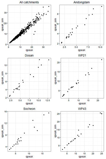 The correlation of and is shown in Figure 8 and Table 2, and the correlation was significant. was calculated using the outputs of the GRM as described in Section 3.2 and was calculated by Equation (20) as described in Section 3.3. The agreement between and is better than that of C and in Figure 7 (compare the dispersion of the runoff coefficients and peak flows in Figure 7 and Figure 8, respectively). Table 2 details the improved r-squared values compared to Table 1, especially for WP42 and WP50. Although WP12 and WP28 have r-squared values below 0.90, the values were still reasonable (greater than 0.79). Table 3 lists the NSE values for and for each of the 50 catchments and the aggregated 50 catchments (“All catchments”). The NSE value in “All catchments” is as high as 0.97. In most catchments, except for three (WP12, WP17, and WP28), NSE values are above 0.9 with a mean of 0.97, which represents a very good correlation. The three catchments WP12, WP17, and WP28 show acceptable NSE values above 0.75.