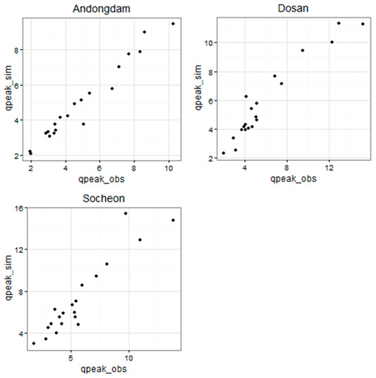 Figure 9 compares the simulated peak flow with the observed (). The of the three catchments were highly correlated with the . Table 4 shows good r-squared values of the three catchments. While NSE values for the Andongdam and Dosan catchments were reasonable, the Socheon catchment had a lower value, which could be due to one large outlier shown in Figure 9. The authors inferred that the water level measurement error is the cause of the outlier, as described in Section 4.1. Therefore, it is determined that the peak flow in the ungauged catchments can be successfully calculated using the rational method, estimated relationship for calculation, rainfall time series, and CN.