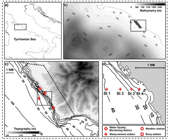 (a) Map of the Tyrrhenian Sea with a part of the study area (in white). (b) Bathymetric map of the Northern Tyrrhenian east coast; the black polygon is the study area. (c) Topographic map of the coastal zone of Civitavecchia and the observatory system. (d) The location of the measurement stations.