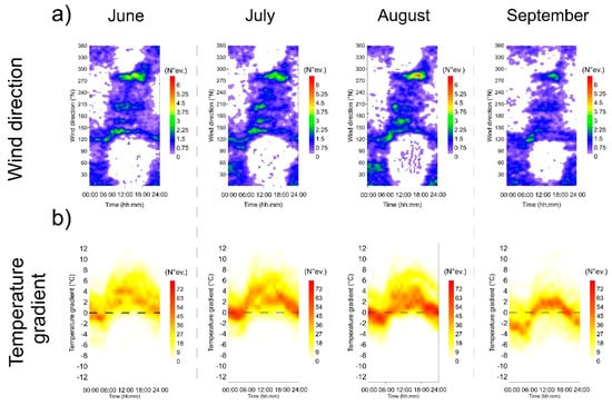 (a) Density plot of the daily distribution of the wind direction (2008–2014); the density plot was calculated for each degree and N° Ev. represents the number of events for the degree. (b) Air-sea thermal gradient during the summer months (2012–2014); the temperature gradient was calculated by subtracting the air temperature values, which were recorded at the weather station, from the sea temperature values that were recorded at the Water Quality Monitoring Station (Figure 1d).