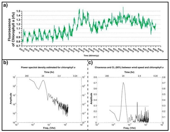 During August 2012, FChla which was recorded by the oceanographic buoy showed a daily cycle (Figure 3a,b) that was characterized by a higher phase between 11:00 and 13:00 and a lower phase both in the early morning (between 4:00 and 6:00) and in the late afternoon (between 18:00 and 20:00). Spectral analysis of chlorophyll a highlights a peak at 24 h and a strong correlation between chlorophyll a and wind speed (Figure 3c).