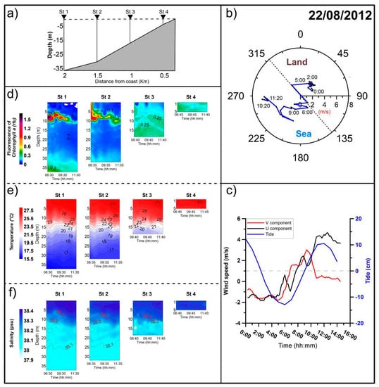 On 28 August 2012 the wind is offshore during the night, blowing for 9 h until 6:10, with a moderate intensity between 4 and 10 m∙s−1 (Figure 5b,c). The signal of FChla shows a decrease over time in the whole water column except for the bottom layer (Figure 5d). The decrease is more marked in the surface layer until 10 m depth. The gradient of FChla signal below 10 m depth is in agreement with the temperature trend which decreases by approximately 1 °C, whereas above 10 m depth, the water temperature is constant over time. The isotherms (Figure 5e) slope upward from the horizontal, especially in station 1 and 2. Station 3 presents a definite thermocline that is characterized by tight isotherms (roughly 23 °C to 26 °C). Above this layer, close to the bottom, the temperature decreases rapidly by about 2 °C. Concerning the salinity structure (Figure 5f) of station 1, the survey results show great variability in the surface layer (>10 m) where the salinity increases from 38.1 to 38.3 psu. The constantly largest salinity occurs between 5 and 15 m depth at stations 2 and 3 over time. Below 15 m, depth records show a uniform salinity structure without changes over time. Furthermore, only in the bottom layer (30–35 m) of stations 1 and 2, the salinity decreases to 38 psu.