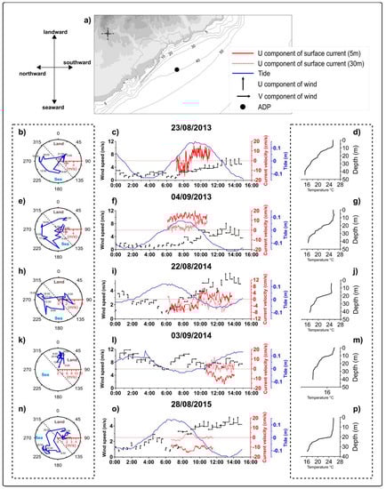 The meteorological conditions on 22 August 2014 (Figure 6h,i) are variable during the day, showing several changes in wind direction and a progressive increase of wind speed from 8:00. At first, the cross-shore component of the wind (Figure 6i) was seaward oriented, while from approximately 7:00, it turned landward, increasing its strength progressively. The tide cycle reached its maximum at 6:00 with minimum levels at 12:00, during which ADP measurements were done. The circulation is characterized by an evident turnover of cross-shore components of surface currents. This was not followed by changes in the bottom currents, which remain offshore oriented. The bottom currents seem to be driven by the effect of lowering tide, while at the surface, the turnover is in agreement with wind. The hydrographical conditions (Figure 6j and Figure 7f) show a stratified water column. This has a definite thermocline that is characterized by tight isotherms of roughly 19 to 25 °C centered near the 22 °C isotherm and a surface layer that is characterized by a temperature of 24.5 °C and a depth of about 20 m. In proximity to the thermocline, the isotherms present oscillations from the horizontal plane: at 9:00, the 24 °C isotherm is at 16 m of depth, two hours later it is at 21 m of depth, and at 12:00, it is at 18 m of depth. Below the 20 °C isotherm, the temperature gradually decreases to 16.5 °C close to the bottom. The 18 °C isotherm are sloping upward until 10:30 and then downward. On the bottom layer, it is possible to observe a thermal increase of about 0.5 °C.