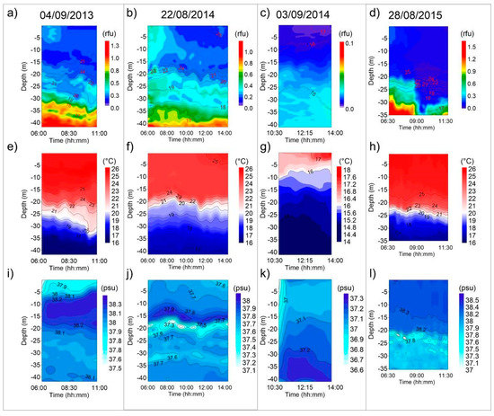 (a) Time series of Fluorescence of chlorophyll a (a–d) expressed in rfu (relative fluorescence units), Temperature (e–h), and Salinity (i–l) at station 1.