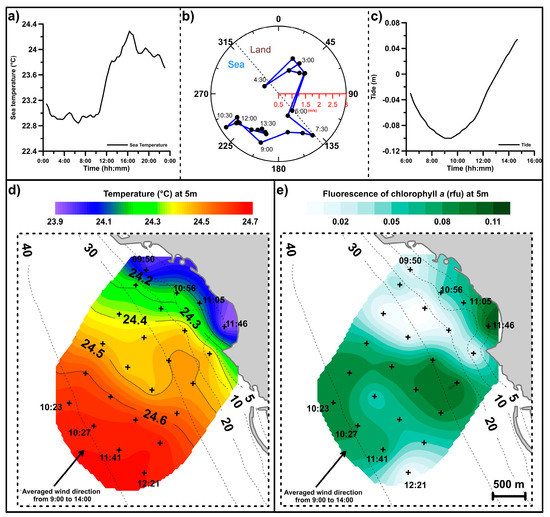 Sea surface temperature (a) at WQMS harbor, wind hodograph (b) and tide (c). Maps of surface Temperature (d) and Fluorescence of chlorophyll a (e) during the 26 August 2016 survey.