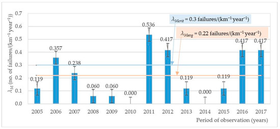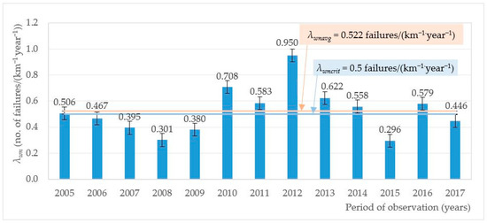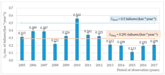 The failure rate for the whole network over the distinguished 2005–2017 time period.