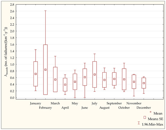 A box-whisker plot of the mean values for failure rates along the WDN in each month of the year and in line with the following operational data for the 2005–2017 period.