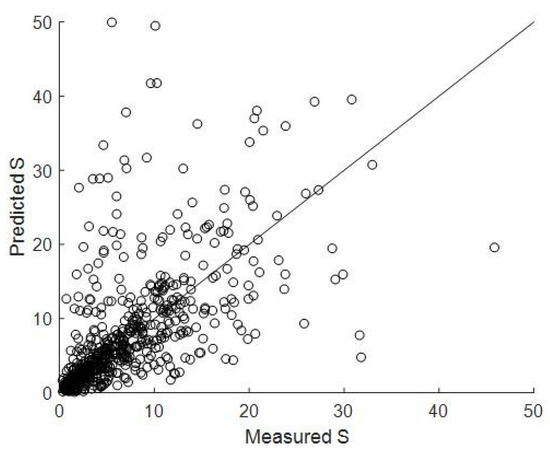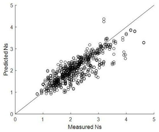 As can be seen in Figure 1 and Figure 2, the stability numbers and the damage levels that are calculated by the empirical formulae do not agree well with those observed in the experiments, so a neural network was proposed to analyze the stability number and the damage level of the structures. Mase [18] proposed a back-propagation neural network model to analyze the stability of the rubble-mound breakwater based on the data from Van der Meer’s 1988 experiment. The stability numbers and damage levels predicted by the trained model are more accurate than those given by the formulae. Dong et al. [19] established five different neural network models to predict the stability numbers and damage levels, and compared the structure and accuracy of the five neural network models. Besides the neural network, a fuzzy logic approach [20,21] and a support vector machine [22,23] can also be effective tools to predict the stability number and the damage level.