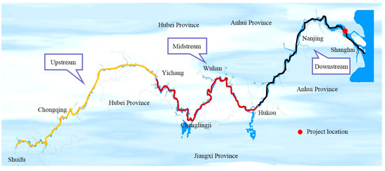 The Yangtze River is a major navigation channel in China, and is known as the “Golden Channel”. The length of the main stem of the Yangtze River is 6300 km. The stream above Yichang is the upper reach of the Yangtze River, which is 4505 km long. The stream between Yichang and Hukou is the middle reach, which is 955 km long. The stream below Hukou is the lower reach, which is 938 km long, as shown in Figure 3. Since 2012, Phase 1 of the 12.5 m Deep-Water Channel Training Project has been carried out downstream of Nanjing to regulate the 56-km-long channel between Taicang and Nantong in order to increase the depth of the channel to 12.5 m.