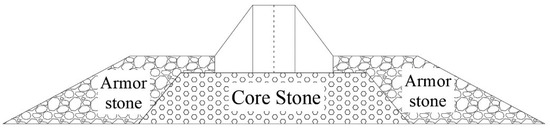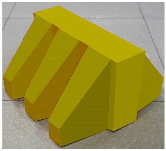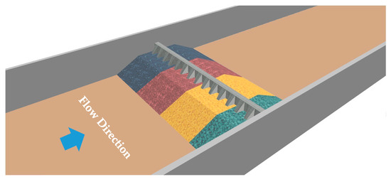 Figure 5 shows the profile of a spur dike with tooth-shaped structures. The spur dike consists of two parts: the upper part is made of precast concrete, and the lower part of the dike is core stone covered by armor stones. The size of each part is marked in Figure 5. It is a submerged dike. Each spur dike block is 6.2 m long, 7 m wide, and 4 m high. A three-dimensional (3D) view of the spur dike array can be seen in Figure 6. The weight of each block is 155.16 t, and the volume of each block is 64.65 m3. The weight of the core stone ranges from 1 kg to 100 kg, and the thickness of the core stone layer is 3 m. The weight of the armor stone ranges from 200 kg to 300 kg, and the armor stone layer is 4 m high.