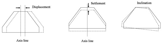 The flow drag and local scour in the vicinity of the structure were the main reasons for the damage to the spur dike [24]. Displacement, settlement, and inclination were the three major damage patterns. Figure 9 shows the schematic diagram of these damage patterns. After a 3-h flow attack experiment, the values of the displacement, settlement, and inclination were measured. Twenty-one (21) measurement points were placed on the axis line of the spur dikes at an equal distance. Each set of data included the values of displacement, settlement, and inclination at a measurement point. Sixteen (16) groups of data were measured, and 336 sets of experimental data were collected in total, which are used in this paper to train the machine learning model.